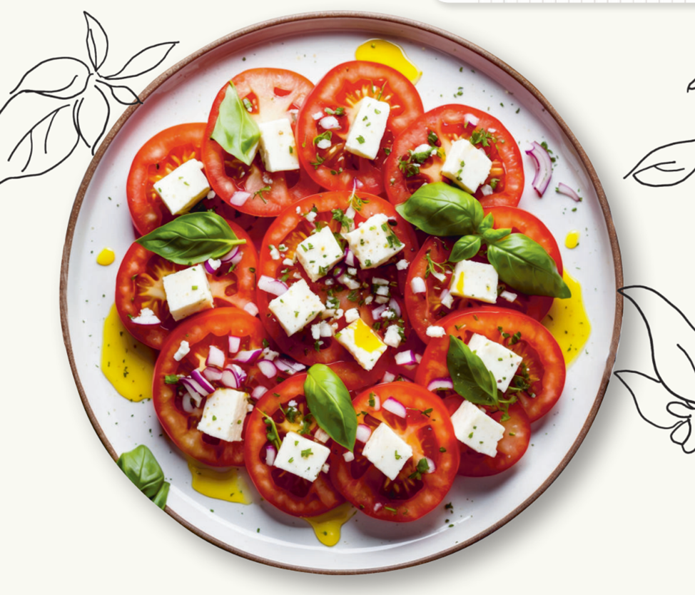 — Базилик зеленый свежий - 30 г Как готовить: 1. Если помидоры сезонные, то кожицу можно не снимать. Если кожица слишком плотная — обдаем кипятком и снимаем кожицу. 2. Лук нарезаем мелким кубиком. 3. Фету (правильную) разбираем на мелкие частички, сама раскрошится. 4. Перебираем базилик — красивые небольшие листья оставляем для украшения, остаток перекладываем в блендер, добавляем оливковое масло и пробиваем до однородной массы. 5. На большое блюдо выливаем и распределяем по всей тарелке соус из