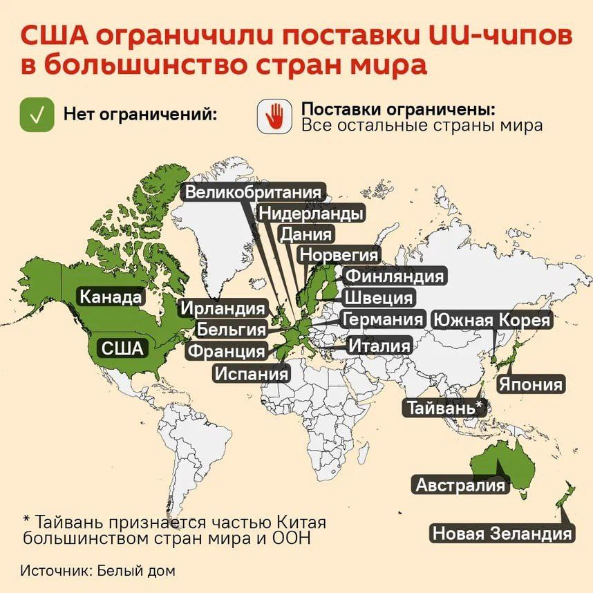 Что стоит за решением Вашингтона, @sputnik_rus рассказал доктор технических наук Николай Шелепин. ▪️ Гегемония превыше всего. США нужно сохранить лидерство любой ценой. Не важно, кто союзник Вашингтона, а кто — нет. Большинство стран мира путем ограничений отрезали от технологий искусственного интеллекта, чтобы те не смогли помешать Штатам. ▪️ Белый список. Запрет не коснулся Тайваня и Японии — без них США не смогут выпускать ИИ-чипы. Американская компания NVIDIA частично производит свои чипы с помощью тайваньской TSMC. У гиганта IBM есть контракты с японской фирмой Rapidus. ▪️ Госдеп не помог. Под ограничения попала даже Армения, на днях подписавшая с США договор о "стратегическом партнёрстве".