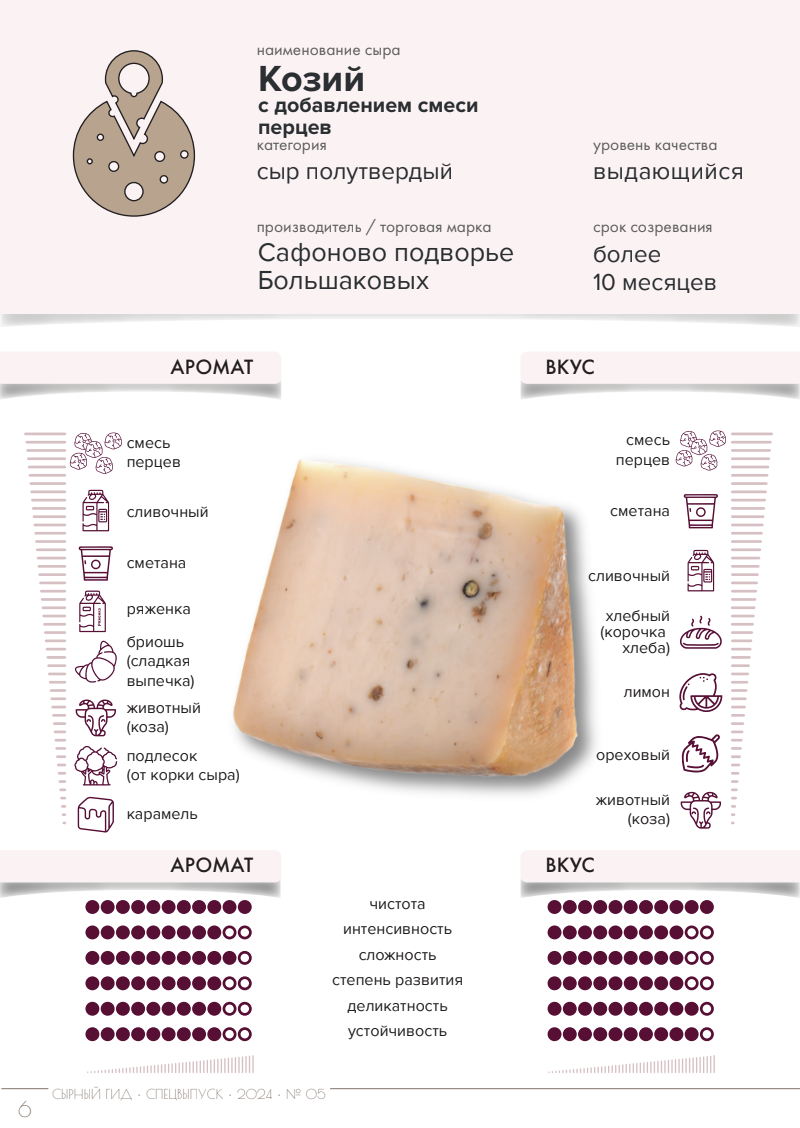 В рамках спецвыпуска журнала "Сырный Гид" о производителях и их сырах сегодня знакомимся с образцами от производителя ООО «Гончаровское» под брендом «Сафоново подворье Большаковых»: 1. Козий с добавлением смеси перцев - сыр полутвердый Отличный образец аккуратного сыра из козьего молока с добавкой перцев. Варианты употребления – в составе сырной тарелки, самостоятельно, в составе холодных блюд. У сыра отличный потенциал для построения сочетаний. Ориентировочная стоимость за 1 кг - 6200-7400Р 2. Манчего - сыр твердый Сыр оставляет отличное впечатление – аккуратный, сбалансированный, объемный, теплый, сливочный, свежий образец. Может конкурировать с зарубежными образцами сыров. Варианты употребления – в составе сырной тарелки, самостоятельно. У сыра отличный потенциал для построения сочетаний. Ориентировочная стоимость за 1 кг - 8000-9200Р 3. Азиаго - сыр полутвердый Сложный, объемный, сливочный, свежий (за счет молочнокислой и лимонной нот) образец сыра, транслирующий «европейский» орга
