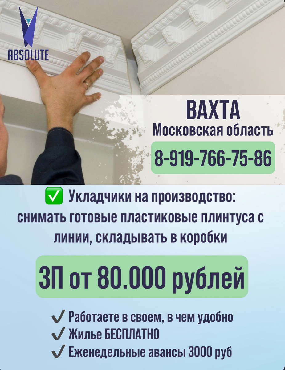 ✔️ Работа на производстве плинтусов, не требующая навыков Московская область, Ступинский район Всего несколько свободных мест: ✅УКЛАДЧИКИ ПЛИНТУСОВ Контакты: ☎️ 89197667586 (WhatsApp) http://wa.me/79197667586 ☎️ 89772511123 (WhatsApp) http://wa.me/79772511123 ПОДПИШИСЬ ✅ 🤳🏽 https://t.me/vahta_ok Наш Телеграм канал с видео о работе и отзывами сотрудников: Работа.Вахта.Абсолют