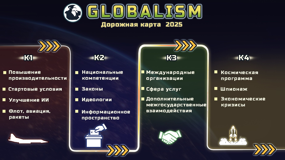 Симулятор современного мира Globalism, вышедший в конце прошлого года, продолжит развиваться и в 2025 году. На днях в официально паблике игры была опубликована дорожная карта, рамках которой в игре появится возможность работать над идеологией внутри своей страны, заниматься международным шпионажем и другие интересные нововведения. Первый квартал: Второй квартал: Третий квартал: Четвертый квартал: Вообще экономические кризисы заявлены в игре изначально, но очевидно, что это одна из самых трудоемких задач, поэтому они и стоят на добавление самыми последними. К этому времени игра должна будет уже обрасти геймплейными механиками и будет более реалистично повторять ИРЛ модель государства.