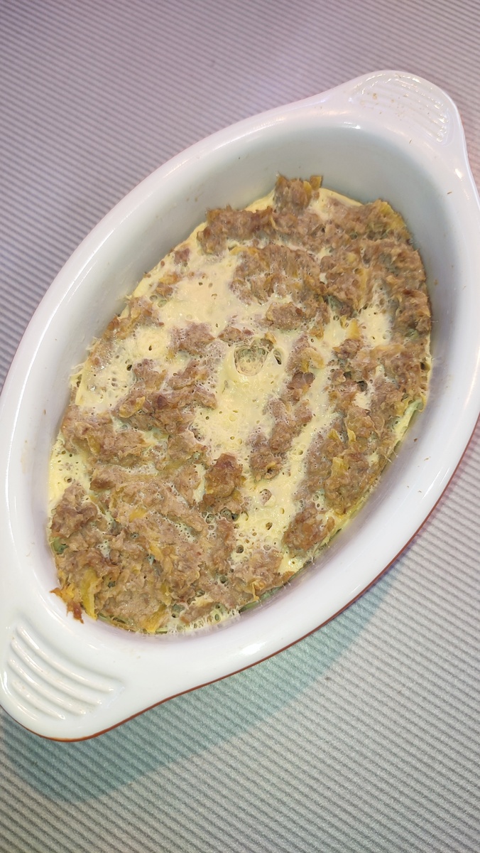 📌Ингредиенты: 150 гр. отварная говядина 150 - 200 гр. натертый на крупной терке и отжатый кабачок 20 гр. сливочное масло соль по вкусу 2 яйца ✅Приготовление: Отварную говядину измельчить в измельчителе. Затем к нему добавить кабачок, соль по вкусу, растопленное сливочное масло и 2 желтка. Всё хорошо перемешать. Белки взбить отдельно до пиков, но не сухих и вмешать в мясную массу. Переложить в жаропрочную посуду, накрыть фольгой и поставить в разогретую духовку до 170С на 30 - 40 минут в зависимости от вашей духовки.