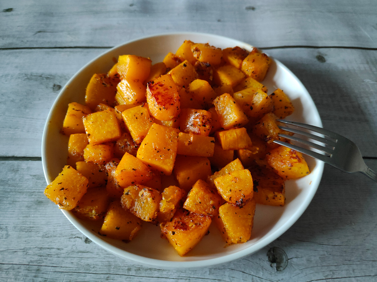 Давно готовлю так тыкву, но выложить рецепт как-то не приходило в голову - ведь похожим образом запекаю и другие овощи: А тут смотрю - рецепт завирусился в сети, и муж настаивает, чтобы я предложила свой вариант. По его словам, он идеальный. Тыкву по этому рецепту можно подать как гарнир к мясу, или в качестве закуски: - тыква неочищенная 700 г - чеснок 2 средних зубчика - масло рафинированное 1 ст.ложка - соль 1/2 ч.ложки - молотые специи: паприка копчёная, перец чёрный или красный острый, сухой базилик - по 1/2 ч.ложки. Тыкву разрезаем на куски, срезаем кожуру. Мякоть режем кубиками примерно 2x2 см: Добавляем выдавленный через пресс чеснок, соль, специи и масло: Тщательно перемешиваем, чтобы соль и специи распределились равномерно по всем кусочкам: Стандартный противень 30х40 застилаем бумагой для выпечки и выкладываем кусочки так, чтобы они не соприкасались: Ставим в разогретую до 200 градусов духовку и запекаем в течение примерно 30 минут⏳ Время запекания зависит от сорта