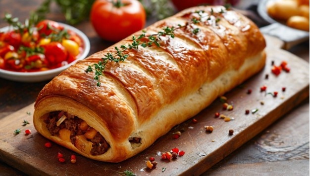 - Классическая мясная кулебяка с сочной начинкой из говядины, свинины и лука, пряно приправленная специями. Такой рецепт подарит насыщенный вкус и сытность.