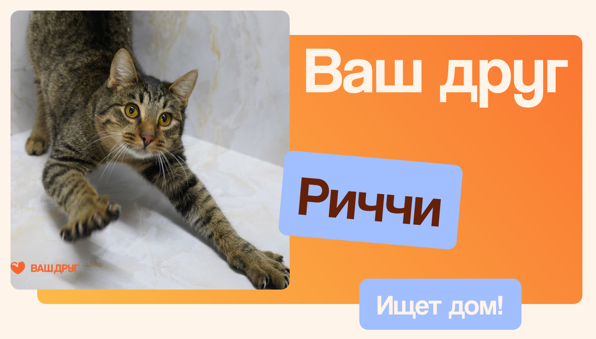 Я — молодой кот с красивым табби-окрасом и выразительными полосками, как у тигра. У меня мягкая шерстка и глаза, которые смотрят прямо в душу. Я люблю наблюдать за всем вокруг и кажусь немного независимым, но в глубине души мечтаю о своём человеке. Я жду вас, чтобы вместе начать новую, счастливую жизнь! Подробнее можно узнать здесь: страничка Риччи