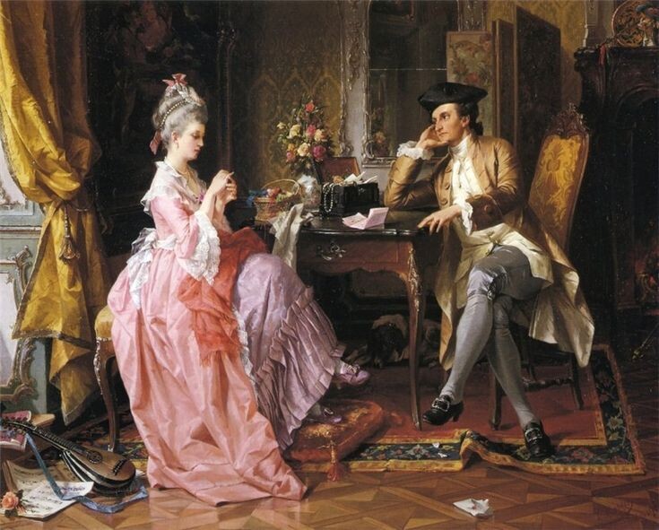 Всадник явно авторитетнее меня, он выше по рангу, званию, знатней. Я военный, а он делец, не военный. Мы заключаем сделку, в которой он главнее меня. Связано с этой женщиной в красном. Она будто не слышит наш разговор, просто присутствует фоном, я её вижу потому, что речь идёт о ней. Между женщиной и этим дельцом есть какая-то связь, родственная и деловая. Его интерес в договоре тоже есть. Договор о чём-то банальном, вроде: берёшь дочь в жёны, я тебе оказываю протекцию. Я посмотрел, что мне это выгодно – она красивая, и я материально не в накладе».