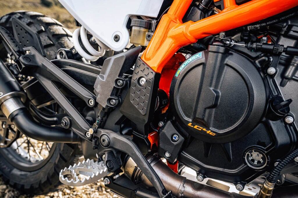 Поглощение ударов осуществляется спереди 43-миллиметровой вилкой WP APEX с открытым картриджем, обеспечивающей ход 230 мм (9,1 дюйма) с регулируемым сжатием и отскоком с шагом в 30 щелчков. Сзади смещенный от центра амортизатор WP APEX может похвастаться 20 щелчками регулировки отскока и ходом 230 мм (9,1 дюйма), а предварительная нагрузка регулируется с помощью быстрого использования инструмента. Новый мот на колесах(спицы) 21″/18″, обутых в резину Metzeler Karoo 4.