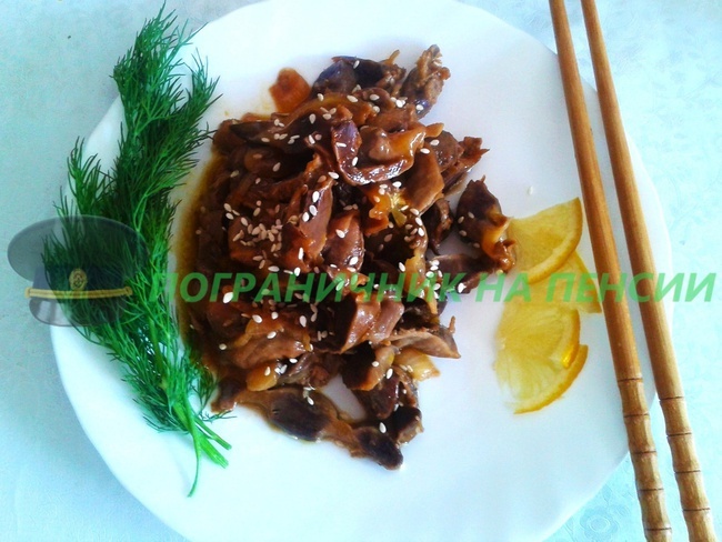 ИНГРЕДИЕНТЫ: 1. Желудки куриные – 1 кг; 2. Лук репчатый – 1 средняя головка; 3. Соевый соус – 3 ст. ложки; 4. Соус «Терияки» - 3 ст. ложки; 5. Кунжут – 10 гр.; 6. Горчичное масло – 50 гр. Куринные желудки тщательно вымываем. Заливаем их кипятком, слегка подсаливаем, варим до готовности, это приблизительно 30 минут. Даем желудкам остыть. Нарезаем желудки вдоль узкими полосками. Конечно, желудки имеют неправильную форму, но надо максимально постараться достичь требуемого результата. Лук нарезаем полукольцами. В сковороду наливаем масло и раскаляем его. В разогретое масло выкладываем нарезанные желудки, и немного обжариваем. Когда желудки обжарятся, выкладываем в сковороду лук. Накрываем крышкой и готовим, пока лук не станет прозрачным. Пока жарится лук. В чашке смешиваем соевый соус с «Терияки». Как только лук стал прозрачным, выливаем в сковороду смесь соусов. Накрываем крышкой и томим еще 5 мин. По истечению 5 мин посыпаем содержимое сковороды кунжутом, перемешиваем и выключаем огонь.