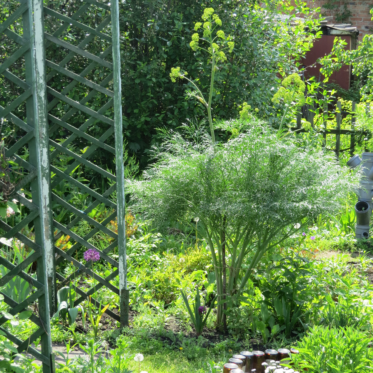 Будем честны: я тот садовод, который плохо вписывается в рамки .. Тот, который впадает в экстаз при виде ...не-не не пиона, и не гортензии, и не розы..про петунию, вообще, тихо помолчим. За что и прилетает постоянно мне критика. Вот нет чтобы про пион (за сто-пятсот тысч) мечтать, она сожалеет о том, что не сперла кусок ферулы.. Да кто ж знал тогда, что сия штука столь редка и почти неуловима?? И что хозяйка оставит свой сад.. Но теперь энтот гигантский "укроп" по имени ФЕРУЛА джунгарская преследует меня даже во снах (в коллаборации с вернонией). Оно мне - НАДО! Это ж - мощь. Это ж - структурность. Раннее отрастание и июньское цветение. Да-да, оно еще и зонтичное. И цвет приятный тех зонтиков. Вписываемый. Листва интересная. Нет, можно листву эту на фенхельную, например, заменить, если душа просит. Но тут то многолетняя. Причем так хорошо многолетние. Растение-то долгожитель. И с возрастом становится только краше. И мощнее, конечно. 170 см высоты - это вам не хухры-мухры. Это солист.