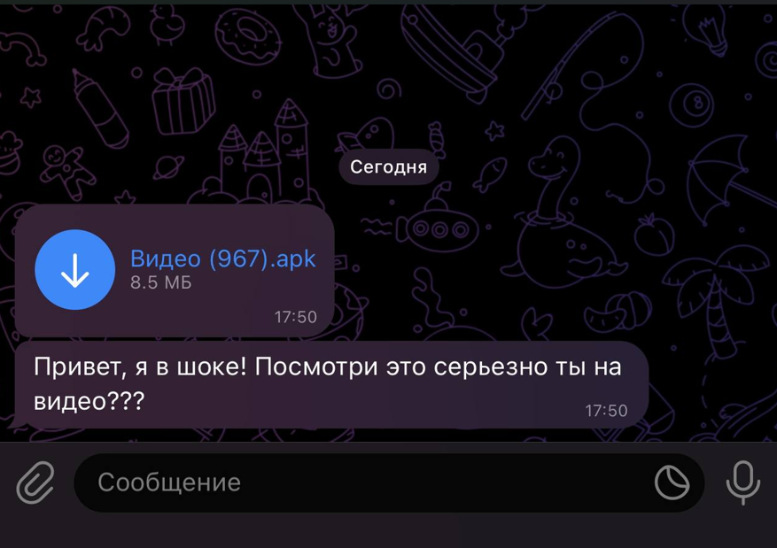 Сегодня мне пришло сообщение, которое вы можете увидеть на скриншоте. Оно выглядит невинно, но это явный пример попытки мошенничества: 👉 Сообщение: «Привет, я в шоке! Посмотри, это серьезно ты на видео???» 👉 Файл с расширением .apk – это файл установки для Android-приложений. В чем опасность? Такие файлы могут содержать вирусы, которые крадут данные с вашего телефона: пароли, банковские данные или даже доступ к соцсетям. После установки злоумышленники могут получить полный контроль над вашим устройством. Что делать, если получили подобное сообщение? ❗️ Ни в коем случае не открывайте и не скачивайте файл, даже если он отправлен вашим знакомым! Для начала свяжитесь с ним напрямую и уточните, что это за файл. Помните, что аккаунт вашего знакомого могли взломать, и злоумышленники могут рассылать вредоносные файлы от его имени. Сообщите об этом своим знакомым, чтобы предупредить их. Подписывайтесь на Телеграм канал https://t.me/ur_ksn