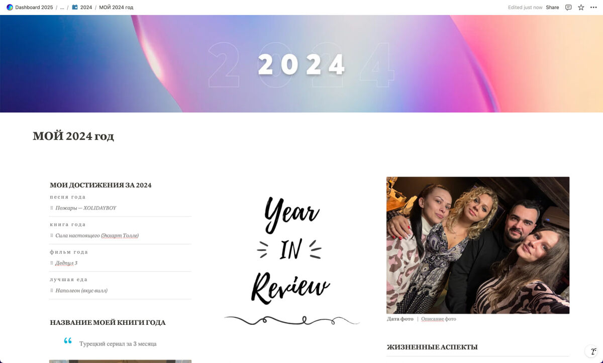 В данном случае, я заполняю красиво оформленную страницу, куда добавляю самые главные фотографии года. Такой дешборд можно распечатать и заполнять от руки. Я планирую распечатать дешборды за прошлые года и собрать книжечки, чтобы время от времени их просматривать, как альбом 😍 ⭐️ Раздел "Мои достижения за 2024г" — песня года — книга года — фильм года — лучшая еда — как бы я назвала свою книгу года (исходя из того, что было за год) ⭐️ Раздел "Мой год в цифрах" — прочитано книг — сделано фотографий — путешествий — часы работы музыки — заработано денег — сэкономлено денег — новых друзей — новых фильмов Необходимо вставить цифры у каждого раздела ⭐️ Раздел "Обзор целей" Необходимо записать цели, которые вы ставили на год и отметить выполненные. А затем указать процент общего выполнения. Вопросы: ❓ 5 вещей за которые я благодарен ❓ 4 лучших момента года ❓ главный инсайт года ❓ вещи, которые я выучил ❓ лучшие моменты года (расписать историю лучшего момента. Чувства, эмоции, мысл