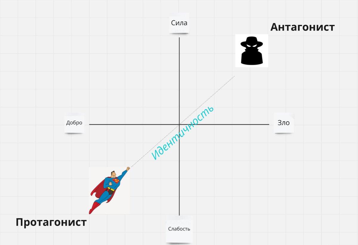 Схематичная шпаргалка по созданию противостояния протагониста с антагонистом. Примечание: это шаблон, который если использовать слишком явно – получится слишком плоско. Но он отлично подходит и для сложных персонажей/историй/отношений, вопрос лишь в том, как автор им распорядится. Что есть на этом рисунке? Центр графика – это общество, социум. Оно находится посередине всех векторов. В социуме не принято выделяться, в социуме человек усреднен по всем параметрам и находится условно где-то посередине добра и зла, силы и слабости. Изначально находится НИЖЕ социума – это означает, что он не вписывается в него, возможно чем-то или кем-то угнетён или обделён. Пример: Гарри Поттер, Нео, Раскольников. Все они в определённой степени являются изгоями в социуме. Изначально находится ВЫШЕ социума – это означает, что антагонисту доступно то, что недоступно обычному человеку (власть, манипуляции, супер-оружие, тайные знания и т.д.). При этом антагонист может быть вне общества. Пример: Волан Де Морт,