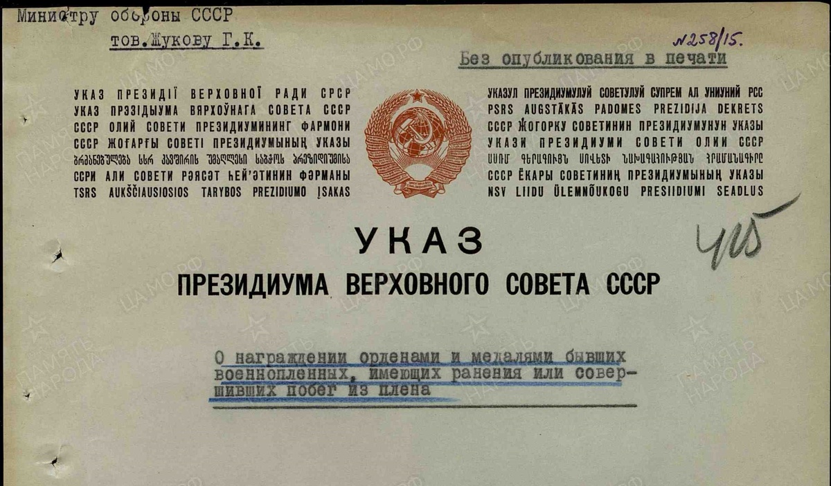 9 августа 1957 года и 27 января 1958 года были изданы Указы Президиума Верховного Совета СССР «О награждении орденами и медалями СССР бывших военнопленных, имевших ранения или совершивших побег из плена».
