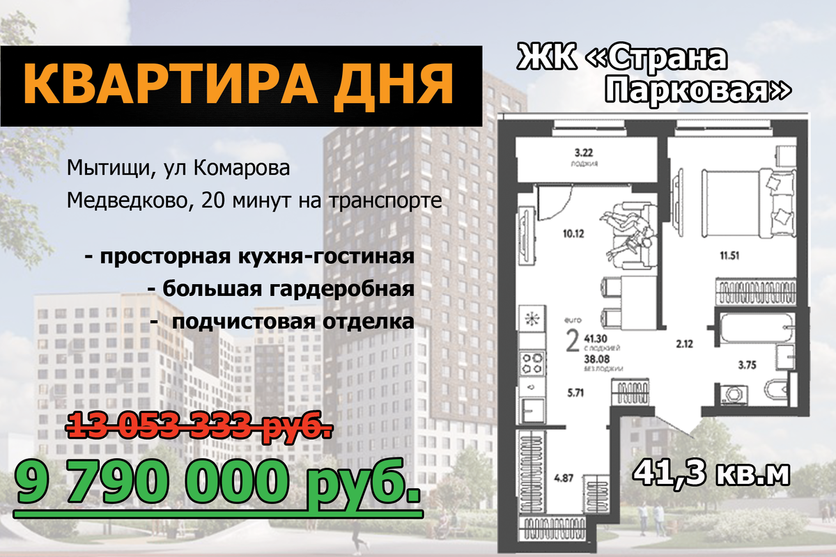 Друзья! Представьте: стильная евродвушка в ЖК «Страна.Парковая» — это не просто квартира, а целая концепция комфортной жизни❗️ ✔️ Площадь 41,3 м², удобная планировка с гардеробной. ✔️ Дом кирпично-монолитный, подчистовая отделка — сделаете ремонт, который хотите. ✔️ Возможность установки системы «Умный дом» — забудьте о бытовых хлопотах. ✔️ Высота потолков 2,7 м и окна, пропускающие максимум света. ✔️ Первый этаж дома — торговая галерея, а ещё прогулочный мост-акведук и собственный сад! До метро Медведково всего 20 минут на транспорте🚇 И вот главное: благодаря брокерской скидке 25% стоимость квартиры составляет 9 790 000 рублей вместо 13 053 333 рублей. А для сотрудников Минздрава от меня ещё -5% скидка Ипотека — от 4%, есть рассрочка. Друзья! Хотите узнать больше❓ Пишите слово «КВАРТИРА» в комментариях, и я отправлю вам подробную презентацию🏙️ ТЕЛЕГРАММ-КАНАЛ► #евродвушкамечты #инвестициивнедвижимость #новостройкимосквы #квартираскидка #странапарковая #мойпервыйдом #умныйдом #недви