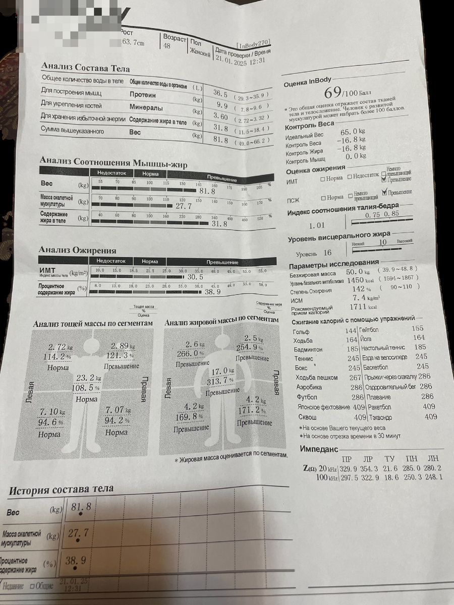 Ну что хочу сказать? Есть над чем работать, но это очень мягко сказано! Всем привет!👋 Меня зовут Ольга. Мне 48 лет. Живу в Москве. На своем канале рассказываю, как похудела на 50 кг, с веса 124 кг, и продолжаю худеть. Предлагаю рецепты низкоуглеводных и ПП блюд, с рассчитанным КБЖУ, и немного рассказываю про свою жизнь. Друзья, в недавней статье рассказала вам, что решила возобновить свои тренировки. Если пропустили эту публикацию, вот тут оставлю ссылку 👇 На сегодняшний день была на 3 тренировках. Но это не силовые тренировки, силовые мне пока нельзя. Занимаюсь пока на беговой дорожке, на велотренажере, и еще несколько тренажеров, чтобы не напрягать свою больную руку. При покупке абонемента в этот фитнес зал, полагается одна персональная тренировка с тренером, и проверка анализа состава тела. Тренера выбирала по рекомендации. Очень милая девушка, в отличной спортивной форме. Ну еще бы! Она же фитнес специалист! Объяснила ей, что у меня проблема с рукой, и напрягать ее нельзя. Это