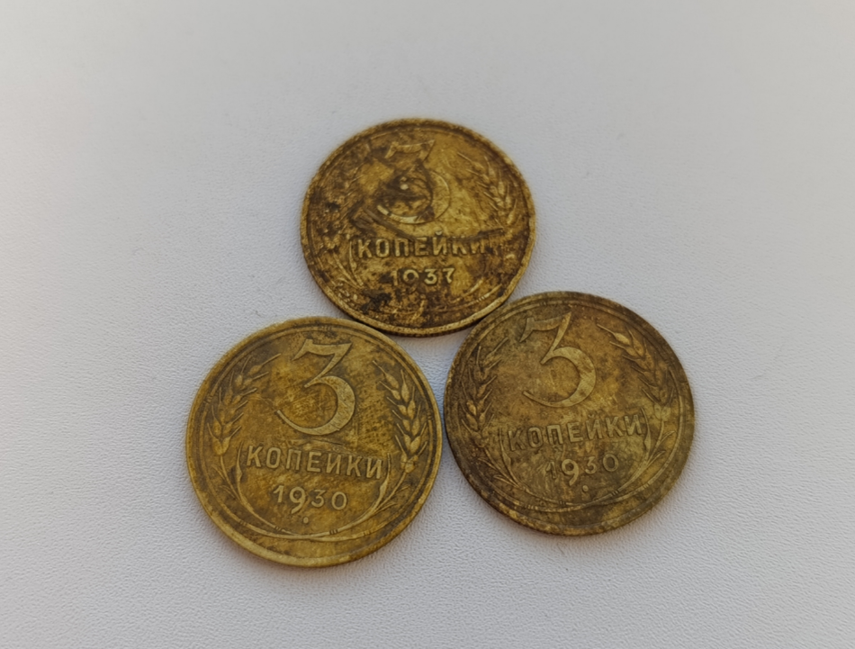 Пока за окном бушует снежная вьюга, я решил немного перебрать советские монетки. Обнаружил три трехкопеечника, которые можно попробовать помыть, чтобы попытаться рассмотреть разновидности, если оные вообще имеются у данных монет. Две монеты - 1930 года, одна монета - 1937 года. Годы самые простые. В процессе чистки я стараюсь сделать так, чтобы монеты получили равномерный цвет, который со временем сам дойдет до нужной кондиции, так как бронза имеет свойство темнеть. Получился вот такой результат (фотографировал уже вечером при свете лампы): 3 копейки 1930 года: Есть одна интересная разновидность - когда аверс отчеканен штемпелем от монеты 20 копеек образца 1924 года. Определить легко - у монеты 20 копеек буквы СССР заметно втянуты. А здесь видно, что буквы СССР вполне обычные (округлые). Монеты - самые простые. 3 копейки 1937 года: У этой монеты есть несколько вариантов. "Перепутка" с 20 копеек - но это не она, так как у 20 копеек звезда плоская, а тут видно, что звезда с разреза