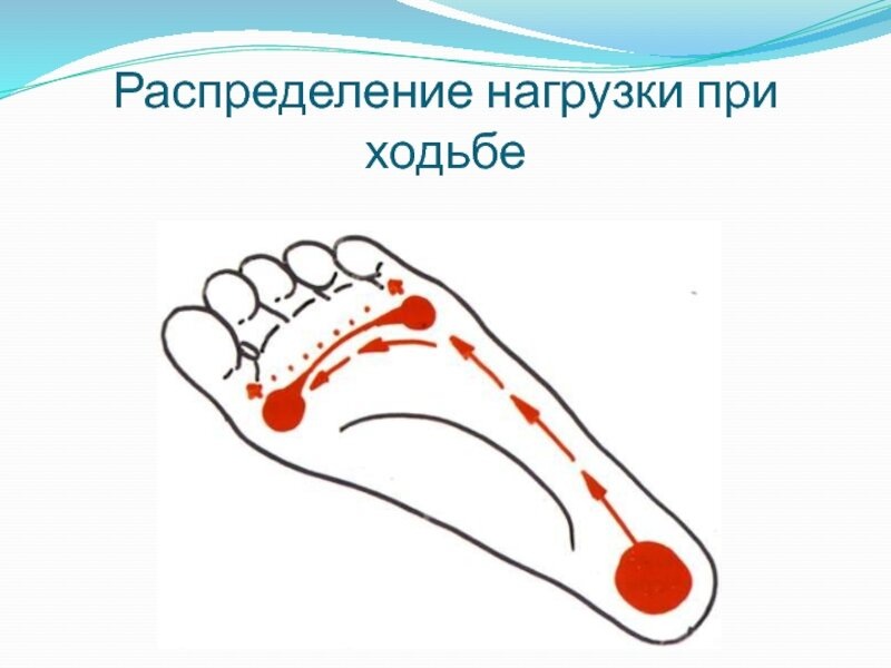 Шаг начинается от пятки по внешней стороне стопы, и далее через мизинец и все пальцы к большом пальцу. В норме вес стоящего человека должен распределяться между пяткой, мизинцем и большим пальцем в треугольнике стопы и арка стопы при этом должна быть сохранена (иначе плоскостопие).