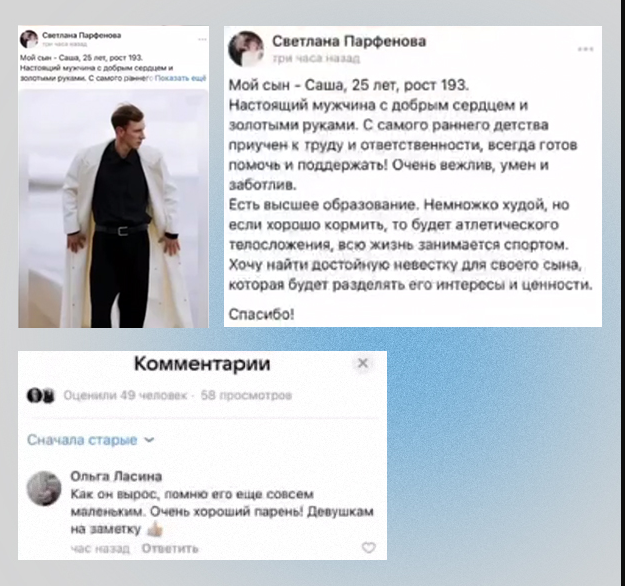 "Маленькие детки - маленькие бедки", а когда детки вырастают (только не в глазах родителей) бедки начинаются уже у них. Просто голова может пойти кругом от родительской заботы - я прочла дивную московскую историю о том, как нежная мать сообразила, что в 25 лет ее сыну уже пора интенсивно искать невесту, и привычно, как, наверное, когда-то решала "всё сама" с выбором школы, кружков, секций и ВУЗа, взяла дело в свои руки: разместила его фотографии и описание на своей странице во «ВКонтакте». "Мой сын Саша, 25 лет, рост 193 см. Настоящий мужчина с добрым сердцем и золотыми руками. С самого раннего детства приучен к труду и ответственности", — объясняет любящая мать в посте. Чтобы потенциальная невестка сразу поняла, что от неё потребуется напряженная вторая смена на кухне, мать года заботливо уточнила, что потенциальное сокровище, которое она готова оторвать от сердца "немножко худой, но если хорошо кормить, то будет атлетического телосложения". Каково же было сыну узнать, что он стал пре