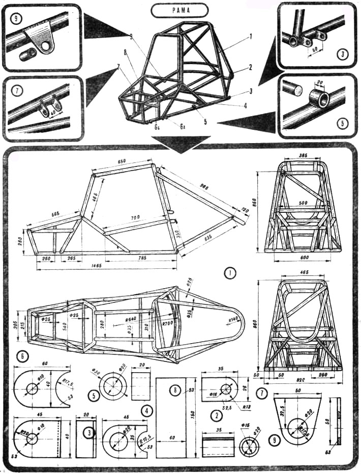 1 - задняя дуга безопасности; 2 - задний откос; 3 - кронштейн крепления заднего рычага; 4 - кронштейн крепления сиденья; 5 - втулка крепления рычага переключения передач; 6а - кронштейн крепления нижнего рычага передней подвески; 6б - кронштейн крепления верхнего рычага передней подвески; 7 - кронштейн крепления верхнего конца амортизатора передней подвески; 8 - пластина крепления рулевого механизма; 9 - кронштейн крепления рулевого вала.