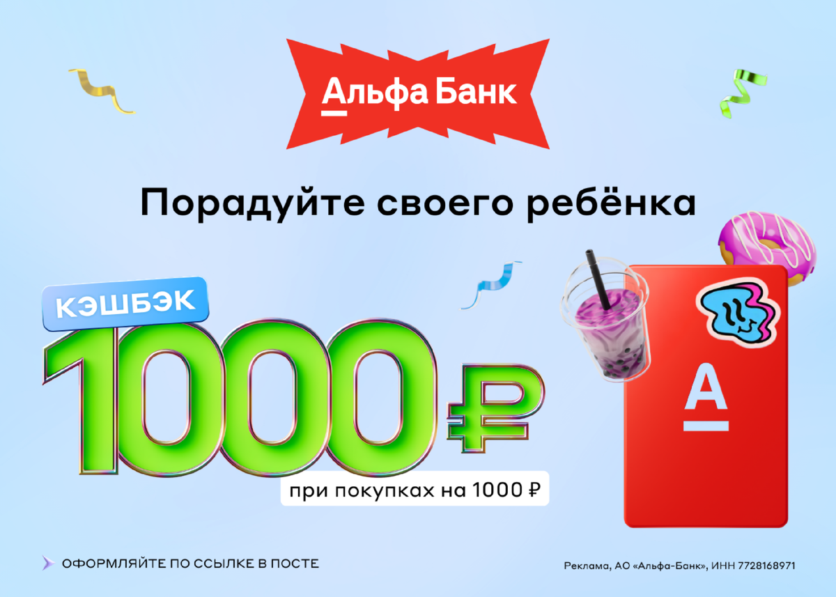 Детская карта, как у взрослого! Карта Альфа-Банка для детей с 6 до 14 лет! Бесплатная навсегда и без условий. - Приложение с финансовыми подсказками и призами. - Расходы под контролем: видно, на что ребенок тратит деньги. - Кэшбэк 5% в категориях на выбор ➕ 1% на всё. 🎁 За оформление бонус – кэшбэк 1000 ₽ при покупках на сумму от 1000 ₽. Гораздо удобнее, чем наличные: безопаснее, можно быстро перевести деньги ребенку в любой момент и смотреть историю покупок. Плюс возможность научить ребенка управлять деньгами: копить, планировать расходы, грамотно управлять своим бюджетом. 😍 Яркие стикеры в комплекте, чтобы украсить карту, как захочется! Оформляйте ее по ссылке https://kids1251.prfl.me/6238cc608d70de4bf05c082d/xud2kb?erid=2VtzqvsfbDM