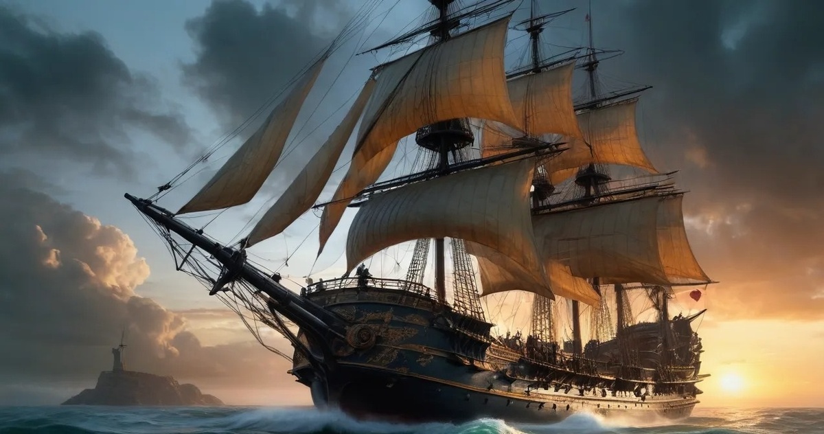 На закате, когда горизонт окрасился в алые тона, вдалеке показалась шхуна. Её чёрные паруса, словно крылья демона, выделялись на фоне умирающего солнца. "Чёрный шквал" был меньше, но его скорость и манёвренность компенсировали разницу в размерах.