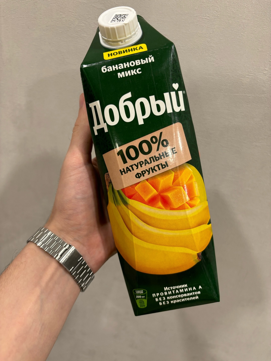 Сегодня хочу поделиться впечатлениями о соке "Добрый" с вкусом "Банановый микс". Это тот самый напиток, который идеально подходит для тех, кто любит сладкое, но не готов мириться с приторностью. Банановый вкус здесь — главный герой, но он не одинок: лёгкие нотки яблока или апельсина добавляют напитку многогранности и свежести. Что особенно радует — консистенция. Сок густой, насыщенный, но при этом пьётся легко. После него остаётся приятное ощущение, будто вы только что съели спелый банан, но без лишней тяжести. Состав тоже внушает доверие: банановое пюре, вода, сахар и лимонная кислота. Никаких искусственных красителей или консервантов — только натуральные ингредиенты. А ещё добавлен витамин C, что делает сок не только вкусным, но и полезным. Упаковка — отдельный плюс. Яркая, с изображением сочных бананов и других фруктов, она сразу привлекает внимание. Можно выбрать удобный формат: маленький пакетик с трубочкой для перекуса на ходу или бутылку побольше для дома. Цена тоже радует — в
