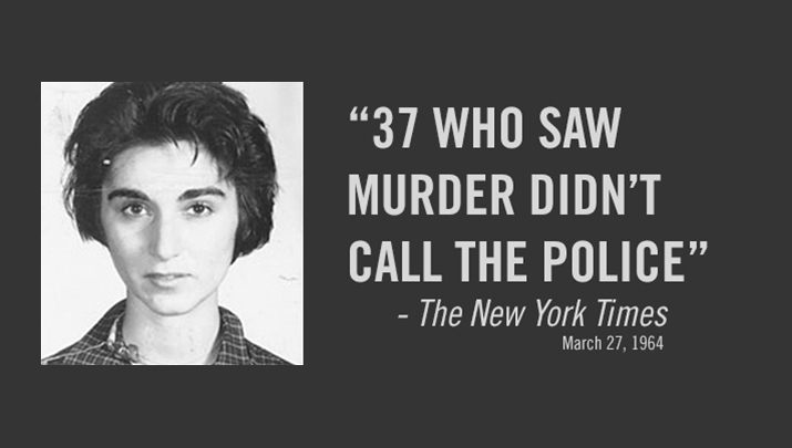 Этот феномен был наглядно продемонстрирован в трагическом случае убийства Китти Дженовезе в 1964 году. Китти Дженовезе была молодой женщиной, которая возвращалась домой поздно вечером. На пути к своему дому она была и жестоко убита. Все происходящее было замечено более чем 30 людьми, которые жили в соседних домах и слышали её крики. Некоторые из свидетелей наблюдали за сценой через окна своих квартир, но, несмотря на ужасающее положение Китти, никто не вмешался. Люди не позвонили в полицию, не попытались прийти на помощь. Нападение длилось целых 30 минут.