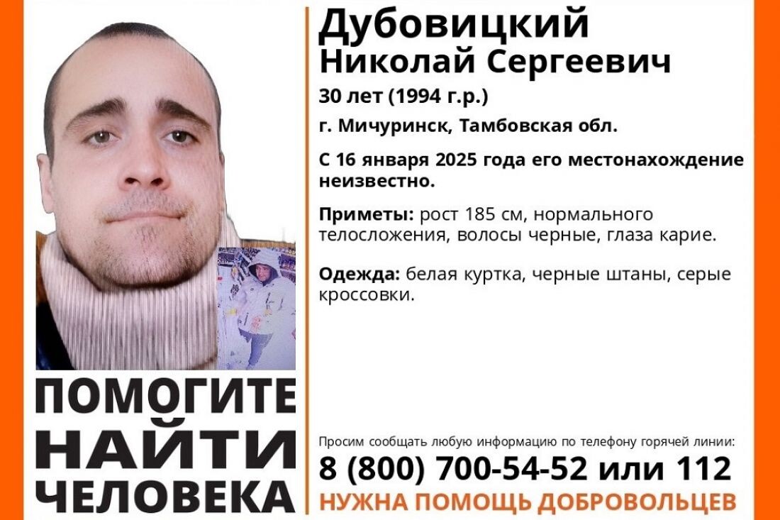 Волонтеры сообщили, что пропал житель города Мичуринск Тамбовской области. Информация о пропаже мужчины появилась на странице поискового отряда «Лиза Алерт» Пензенской области в соцсети «ВКонтакте». Местонахождение Николая Дубовицкого неизвестно с 16 января 2025 года. Сообщается, что мужчина может находиться в Пензенской области. Приметы пропавшего: рост 185 см, нормальное телосложение, черные волосы и карие глаза. В день исчезновения он был одет в белую куртку, черные штаны и серые кроссовки. «Просим сообщить любую информацию по телефону горячей линии 8 (800) 700-54-52 или 112», — написали волонтеры поискового отряда. Ранее мы писали, что СК выясняет обстоятельства смерти ребенка при пожаре в Пензенской области.