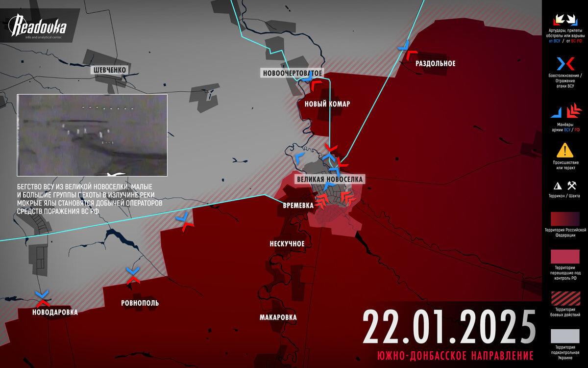 Редакция Readovka собрала самые важные события 22 января в разрезе СВО. Русские войска вошли в Великую Новоселку, подразделения ВСУ по большей части уже бросили позиции там. ВС РФ также добились значимого успеха и на Купянском направлении. Занято село Западное, которое станет подспорьем в общем укреплении положения русских войск за Осколом. Президент Украины Зеленский признал, что был обманут Западом относительно перспектив незалежной как члена НАТО..