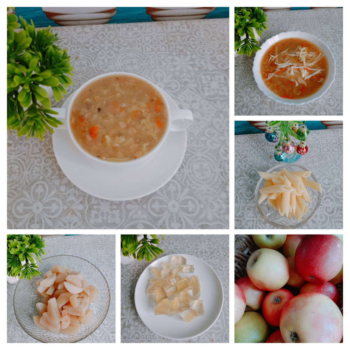 Завтрак - суп гороховый с квашеной капустой; холодные макароны вместо хлеба.