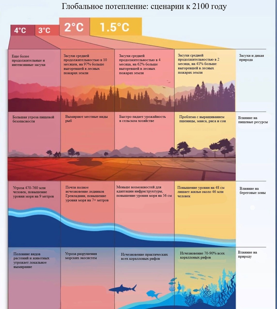 Перевели для вас инфографику из отчета по адаптации к изменению климата UNEP, где можно наглядно увидеть, к чему ведут разные сценарии потепления.