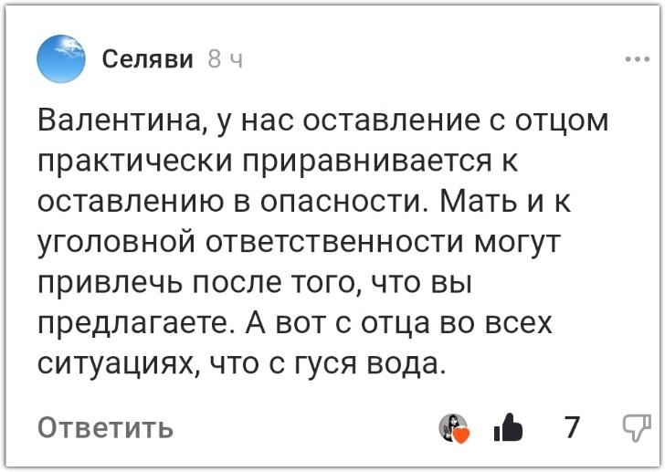 В комментах к посту о том, как отдать ребёнка отцу, появилось мнение: если мать просто исчезнет с чемоданами из квартиры, оставив детей папе без предупреждения, то её покарают с применением УК РФ. Поводом для обсуждения стало это предложение: Отдавать по тому же принципу, что и папа отдает. В идеале съезжать с квартиры самой с вещами. С утра была дома с детьми и отцом, вечером отец и дети дома, ты уже на съемной квартире. Я не вывожух, я ухожу, новый адрес не скажу, дети с тобой. Второй вариант - дети с вещами к отцу под дверь, смс "дети с тобой, уехала в другой город, не заберу". Не согласен? Опеку вызовет? Ну, пусть вызывает. Опека поругается, заведет дело, выдаст штраф тысяч 5. Ничего серьёзного за оставление ребенка у дверей отца с вещами не будет, прав за такое не лишают. За то речи о том, чтобы оставить ребенка с матерью уже не будет. Опека в суде на г-но изойдется, но ребенка отдадут отцу. Тут вопрос не как отдать ребенка, а как после этого поддерживать с ним отношения. Дите ж