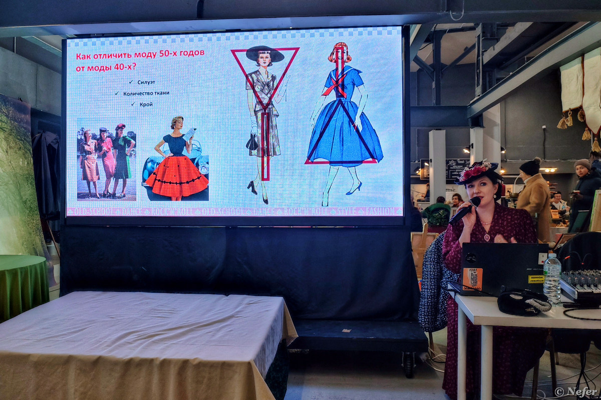 Все привыкли, что "Мосвинтаж" - это рынок старины и ремесленных товаров. Однако, не менее интересен лекторий. Темы интересные и уникальные. Вот Юлия Маррр рассказывает про послевоенную моду. Название лекции: "Элегантность 40х - стиль на руинах". Основных тенденции моды этого десятилетия схематично показаны на заглавной фотографии. Низ платья очень простой, весь декор (если он есть) на топе. В 50-е же наоборот, верх скромный, но юбка широкая и пышная. В 40-е женщина были рабочей единицей, а не предметом восхищения. Надо было восстанавливать страну. Это отражалось на одежде. Часто женщины носили костюмы, строгие, если не сказать, грубые. Чтобы пошить платье, нужно было достать ткань. Слышала, что в год советскому человеку полагался 1 метр ткани. Чтобы сшить платье, требуется минимум 3 метра, а значит ждать три года. Женщины стали носить брюки. В ход шло все. Многие мужчины не вернулись с войны, их одежду перешивали. Сначала для себя, потом для детей. Девушки носили элегантные шляпки. Это