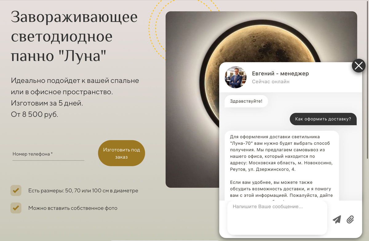 После этого вы сможете получать уведомления о заказах прямо в Телеграм. Просто нажмите "Создать бота для сайта", пришлите картинку для аватара, придумайте имя и должность вашему консультанту, а также фразу для приветствия. Затем нажмите "Сгенерировать инструкцию". Вам придет ссылка на документ, в котором будет инструкция для вашего консультанта, включая сведения о вашей компании и условия отправки уведомлений.