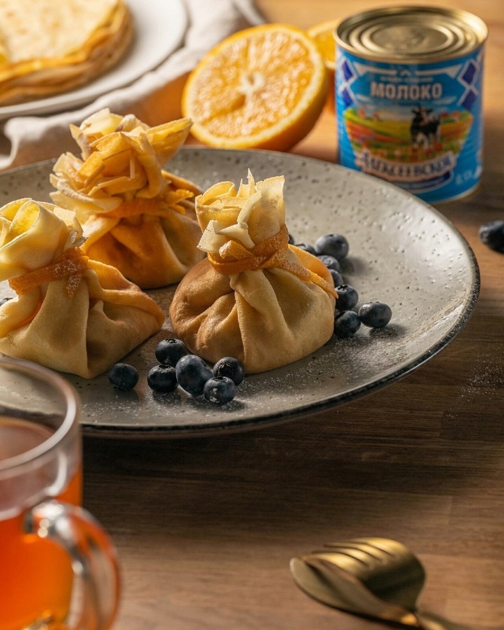 Блины — блюдо, которое любят и дети, и взрослые по всему миру. У этого лакомства множество названий и, конечно же, у каждого есть свой семейный секретный рецепт, который передается из поколения в поколение! Мы решили поделиться своим, с очень красивой подачей — блинные мешочки. А в качестве начинки — тающая во рту груша и натуральное сладко-сливочное сгущенное молоко. Это сочетание точно станет вашим любимчиком! Блинные мешочки с карамелизированной грушей и сгущенным молоком. Ингредиенты: Груша — 2 шт.;