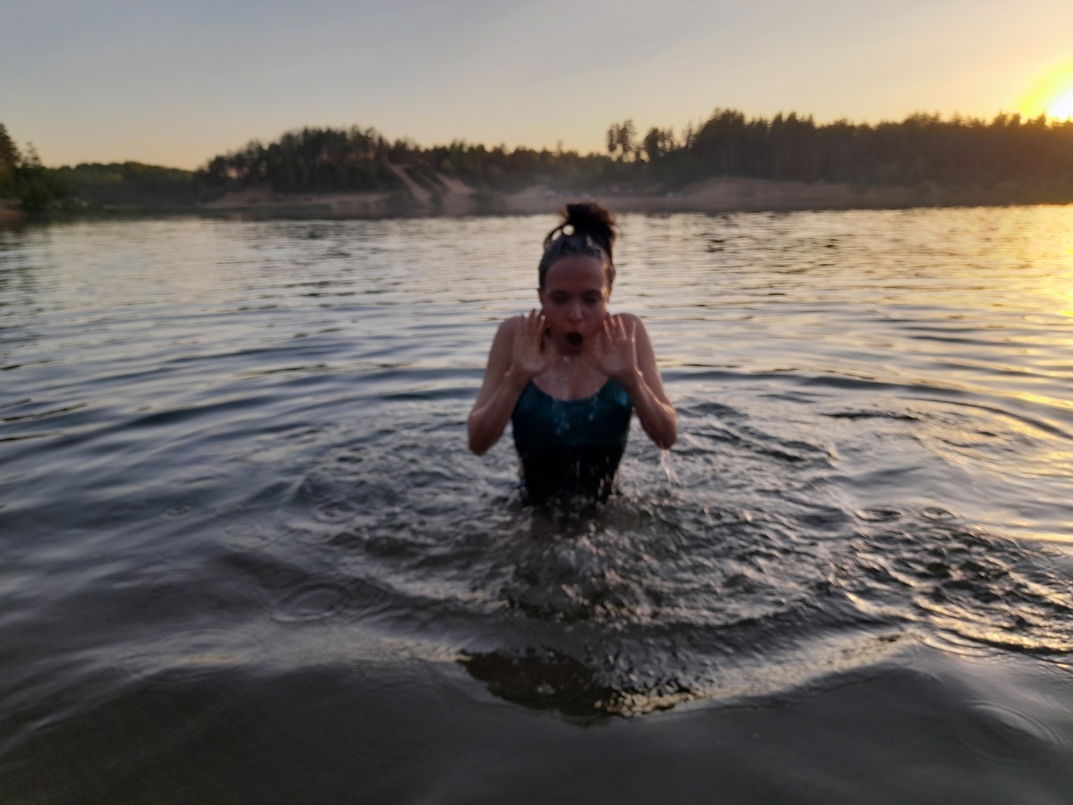 Настя купается в первый раз в сезоне, поэтому ей холодно, и она от эмоций поднимает кучу брызг.