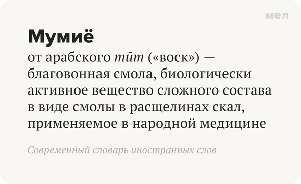 Все мы знаем, что такое мумия и где ее можно встретить. Не исключено, что кому-то из читателей «Мела» даже известен примерный рецепт изготовления мумии. А вот мумиё — «лекарство», которое до сих пор применяют в нетрадиционной медицине, — к мумиям имеет отношение? Речь пойдет о Средних веках — так что будет жестко, приготовьтесь. В европейских фармакопеях XV–XVI веков нередко встречается лекарство под названием mumia. У этого «лекарства» весьма любопытная история — и, немного забегая вперед, скажем, что в большинстве случаев речь в средневековых рецептах шла про вещество, которое буквально добывали из египетских мумий (а когда мумии закончились — из кого придется). Как сообщает «Современный словарь иностранных слов», изначально словом mum (»воск») в древней арабской медицине называли черную смолу природного происхождения, которую собирали в расщелинах скал и использовали в качестве припарок и противоядий. Но примерно в XI веке источником этого вещества по ошибке (!) стали считать черное