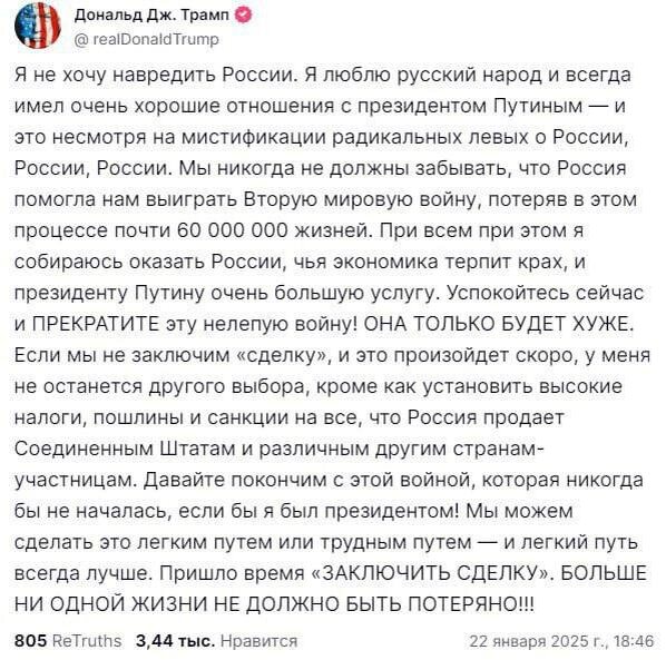 Ну что, граждане любители Трампа, вам ничего не жмет, нет? А я ведь говорил... 60 млн. советских граждан погибло, из 190 млн. всего населения. А почему не 60 миллиардов. Цифры примерно одинаково соответствуют действительности. И да, а действительно, Советский Союз помог Америке войну выиграть, а не наоборот? Учитывая, что именно Советская армия уничтожила примерно 70% всего вермахта? И это не считая откровенно хамского тона. В общем, если Трамп хотел максимально усложним как отношения с Россией вообще, так и переговоры по окончанию конфликта на Украине в частности, то своего он добился.
