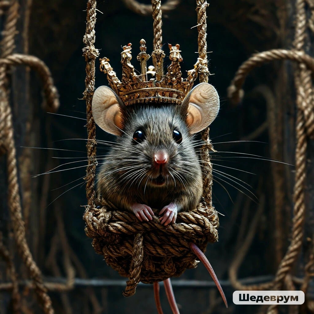 Вот они шли шли шли... И остановились... Они были потрясены: король мышей был привязан к потолку верёвками. А рядом стояла железная мышь и говорила: "Отдашь корону--отпущу!"