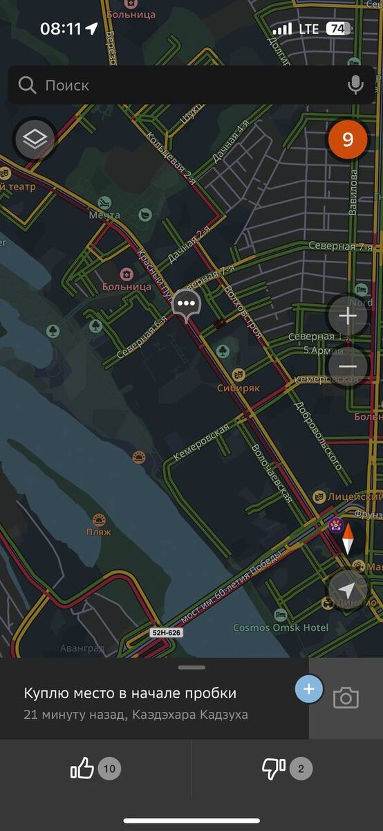 Пробки в городе достигли 9 баллов. Особенные затруднения отмечаются на Красном Пути, Метромосту (полоса на правый берег), проспекте Мира и подъездах к мосту у Телецентра.