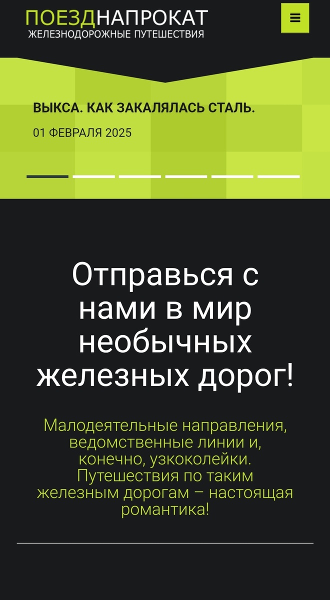Недавно я нашёл сайт "турагентства" "Поезд напрокат". На нём было много интересных туров, и у каждого были свои плюсы и минусы. Начнём с оформления сайта. Интересный дизайн, хорошее приветствие. Но не хватает фотографий туров. Ставлю девять железнодорожных фанатов из десяти. Пройдём в меню. Как видим, меню просто развёртывается, а не открывается отдельная страница, это удобно, мягкий, плавный переход, всё понятно. 10 фанатов из 10 Идём в "Ближайшие поездки" Открывается не очень удобно, 7 фанатов. Но если закрыть меню... Смотрим туры. Надо нажать не на картинку, а на текст, за что и ставлю 6 ЖД фанатов из 10. Смотрим тур, неважно, что группа набрана. Необычный тур, очень интересный. Идём дальше. Супернасыщенная программа! Но цена высокая. И это неудивительно! Идём дальше. Осталось немного. Класс! Круто! Только дороговато. Осталось совсем чуть-чуть. Вот эта программа по-моему самая интересная. Недорого, но и хорошо. Кстати, если мне ехать из Москвы до Вла
