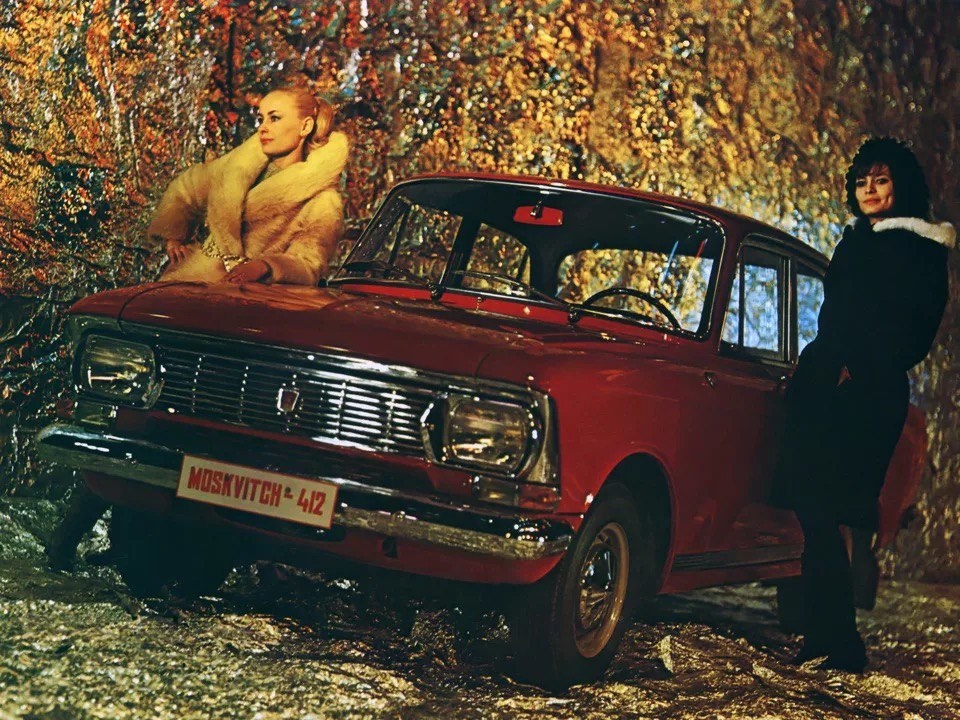Вот посмотрите, ярко красный 408 - экспортный автомобиль, который за границей назывался не Москвич а Элит 1500. Потенциальному зрителю предлагалось порадоваться за мужика. Он купил себе Элит и вокруг него сразу женщины. Друзья на заднем плане.
