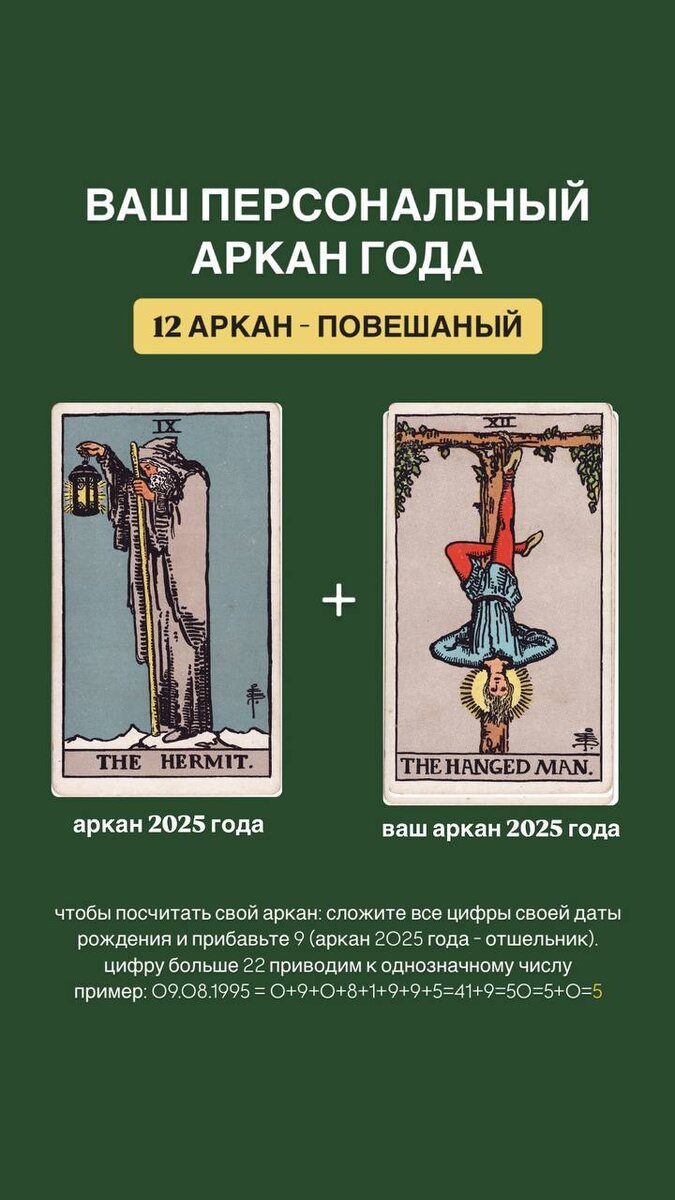 2025 год, если сложить все цифры 2+0+2+5 = 9 пройдет под 9 арканом ОТШЕЛЬНИК, подробнее о том, что принесет нам этот год можно прочитать в моей статье. Но на нас весь год влияет энергия не только отшельника, но и персональный аркан таро 2025 года. Он задает главные темы, события, атмосферу, то на что будет направлено все наше внимание. КАК ПОСЧИТАТЬ ЛИЧНЫЙ АРКАН СМОТРЕТЬ ЗДЕСЬ. Если при расчетах у вас получилось число 12 - Ваш персональный аркан 12 ПОВЕШЕННЫЙ. Давайте поговорим про символизм, чтобы вы сильно не пугались от названия карты. 12 Аркан, мы видим с вами на карте не просто какого-то чувачка, который решил повеситься, от скуки смертной. Мы видим с вами Бога - это Бог, который подвесил сам себя на священное дерево, чтобы познать руны. На карте видим просветление, которое исходит от головы нашего повешенного. Мы не видим, что ему плохо. Мы не видим, что он плачет. Мы не видим, что он умер, то есть человек повесил сам себя. Традиционно - эта карта называется самопожертвованием,