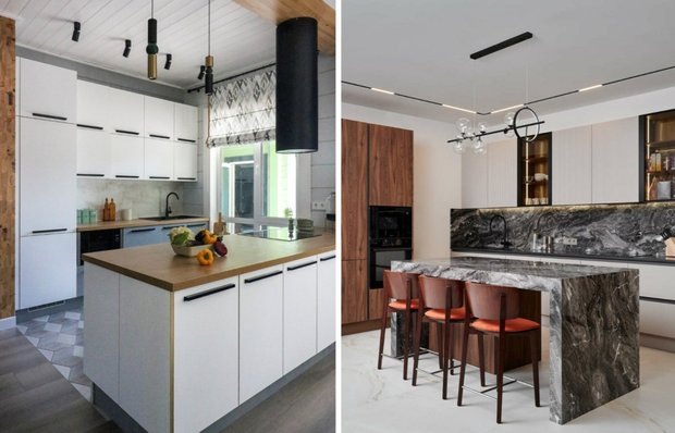 Порция вдохновения и интересных идей, которые стоит взять на заметку Кухонный остров — это отдельностоящий рабочий модуль на кухне. Он может выполнять разные функции, выступая дополнительной рабочей поверхностью, местом хранения или обеденным столом. Собрали пять интерьеров стильных кухонь с островом, которые стали сердцем интерьера. В этой просторной кухне остров расположили прямо посередине, по оси между двумя проходами. На острове находится мойка, а место для готовки с плитой располагается справа, под окном. Таким образом удалось организовать удобную обеденную зону и увеличить рабочую поверхность кухни. Эта кухня находится в загородном доме известной певицы и автора песен Лены Катиной. Остров для нее был обязательным элементом — за ним семья собирается на завтраки, обеды и ужины. Также он служит удобной рабочей поверхностью и дополнительным местом для хранения: со стороны кухни в острове предусмотрено несколько выдвижных ящиков. Столешница острова из натурального мрамора смотрится о