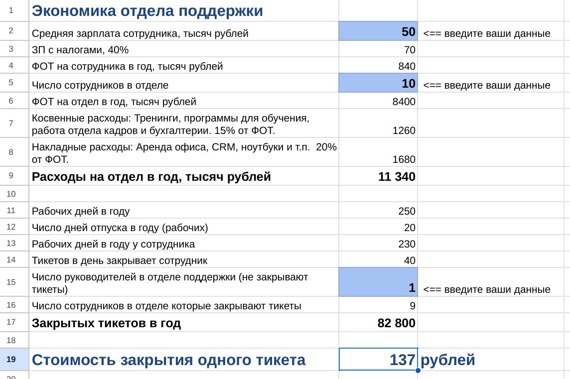 Начало года — отличное время оценить расходы на поддержку за 2024 год и понять, как сократить их в будущем! 🎯 Мы создали калькулятор, который помогает честно рассчитать стоимость одного тикета. Он учитывает налоги, накладные и косвенные расходы. ✍️ Как это работает? Вы вводите данные о вашем отделе в синие ячейки таблицы, а калькулятор считает общие расходы и делит их на количество закрытых тикетов за год. Сделайте копию Google-таблицы и рассчитайте свои данные: Ссылка на калькулятор. Хотите узнать, сколько будет стоить закрытие тикета ботом в вашей компании? Напишите нам: https://t.me/use_wikibot.