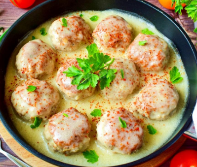 Ингредиенты: - 800 г говядины (мякоти) - 100 г жира - 3 ломтика батона - 2 яйца - 1 стакан растительного масла - 2 ст. л. сливочного масла - 1 луковица - 2 ст. л. мясного бульона - 1 стакан молока - 1 стакан сметаны - 1 стакан муки - зелень петрушки - красный молотый перец - соль Приготовление: Обжарьте лук, пропустите его через мясорубку вместе с промытой говядиной, жиром и размягчённым в половине стакана молока хлебом. Затем добавьте яйца, мелко нарезанную петрушку, соль и перец по вкусу. Влейте в фарш немного мясного бульона и хорошо перемешайте. Сформируйте из получившейся массы небольшие шарики, обваляйте их в половине стакана муки и обжарьте с обеих сторон в горячем растительном масле до полуготовности. Теперь растопите сливочное масло, смешайте его с остатками муки и жарьте до золотистой корочки. После этого медленно введите оставшееся молоко и полстакана сметаны. Полученной массой залейте тефтели, которые вы заранее выложили в кастрюлю, и варите на слабом огне около 30 минут. К