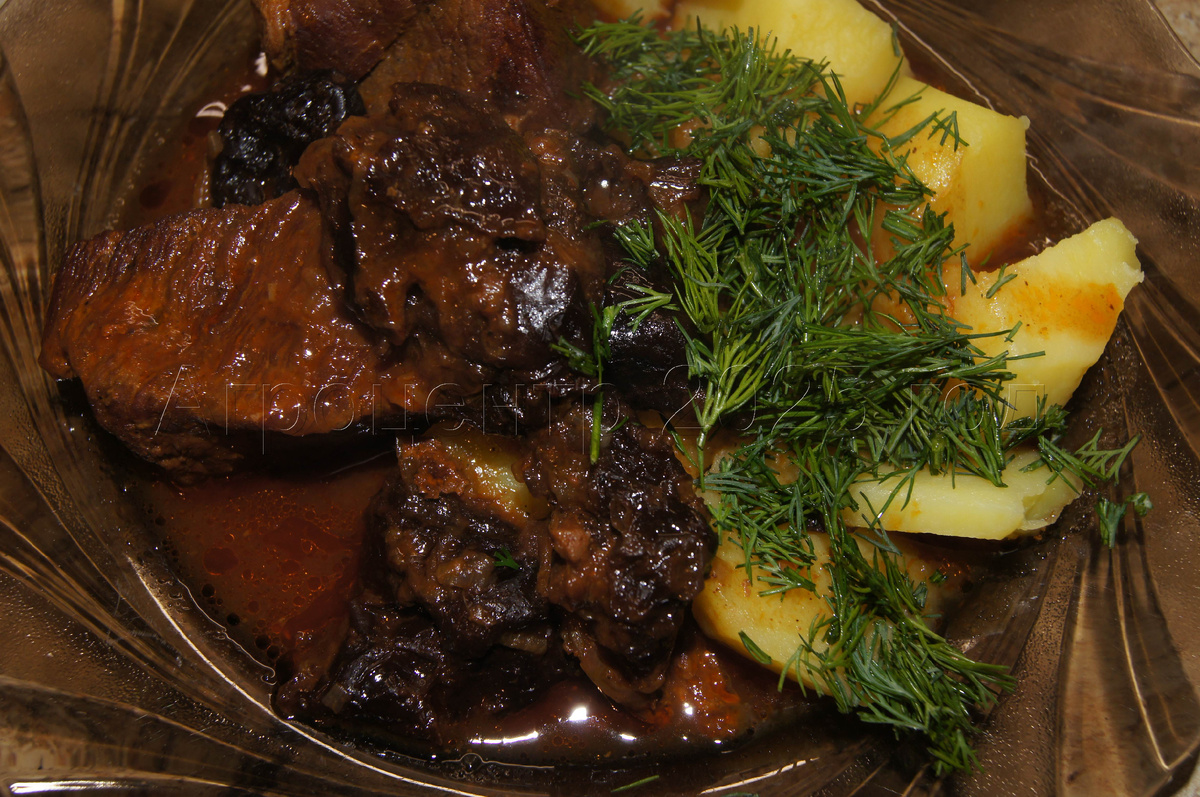 (Сборник рецептур блюд и кулинарных изделий 1982 год) Состав (указан вес нетто) Говядина (боковой и наружные куски тазобедренной части) – 167 Жир животный топленый пищевой – 10 Лук репчатый – 25 Томатное пюре – 20 Чернослив – 50 Масса тушеного мяса – 100 Масса соуса с луком и черносливом – 125 Гарнир – 150 Выход блюда – 375 Приготовление