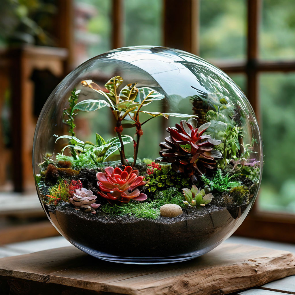- Растения: суккуленты, мхи, миниатюрные папоротники.