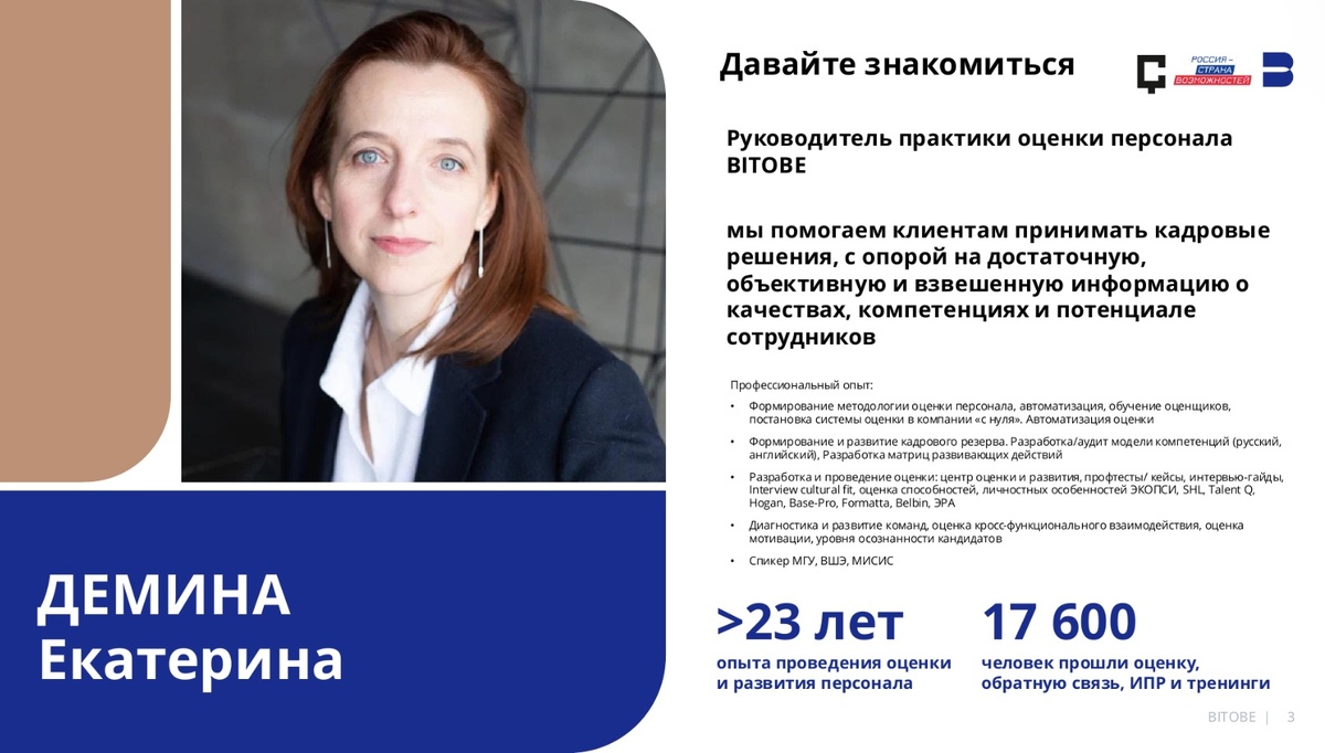 Второе выступление из моего топ-3 с мероприятия «Россия - время команд» – это презентация Екатерины Деминой, Руководителя практики оценки персонала консалтинговой компании BITOBE.