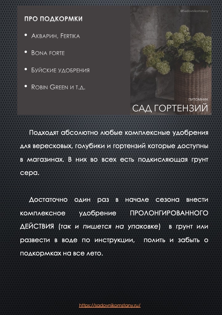 Важно помнить, что гортензия, это растение и все питание она берет из почвы. Для тех, кто не хочет тратиться на удобрения, позже, я поделюсь способом ведения гортензий без внесения минералки, я сама им пользуюсь в своем саду. Если такая статья нужна, пишите в комментариях, я подготовлю методичку по органическим подормкам. Сегодня же о готовых покупных минеральных комплексных удобрениях. Скачать ее можно ниже. Итак, чем же запастись в свою аптечку, что б гортензия, голубика или рододендрон порадовали вас. СКАЧАТЬ МЕТОДИЧКУ ЗАКАЗ ГОРТЕНЗИЙ ЧЕРЕЗ САЙТ https://sadovnikomstany.ru/ Подробности по заказу гортензий уточняйте по телефону в ватсап https://wtsp.cc/89160909966 YouTube https://youtube.com/@Sadovnikomstany Yandex Dzen https://dzen.ru/sadovnikomstany VK https://vk.com/sadovnikomstany TG: https://t.me/sadovnikomstany